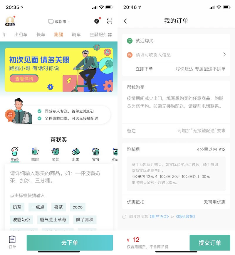 滴滴正在测验跑腿事务,以对立美团的跑腿代购、京东旗下闪电送等服务。现在该服务正在成都和杭州试点,依据