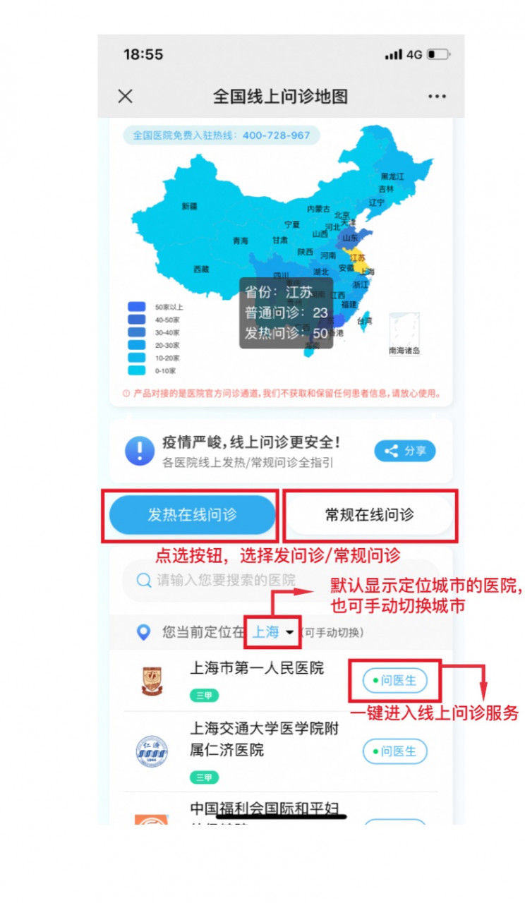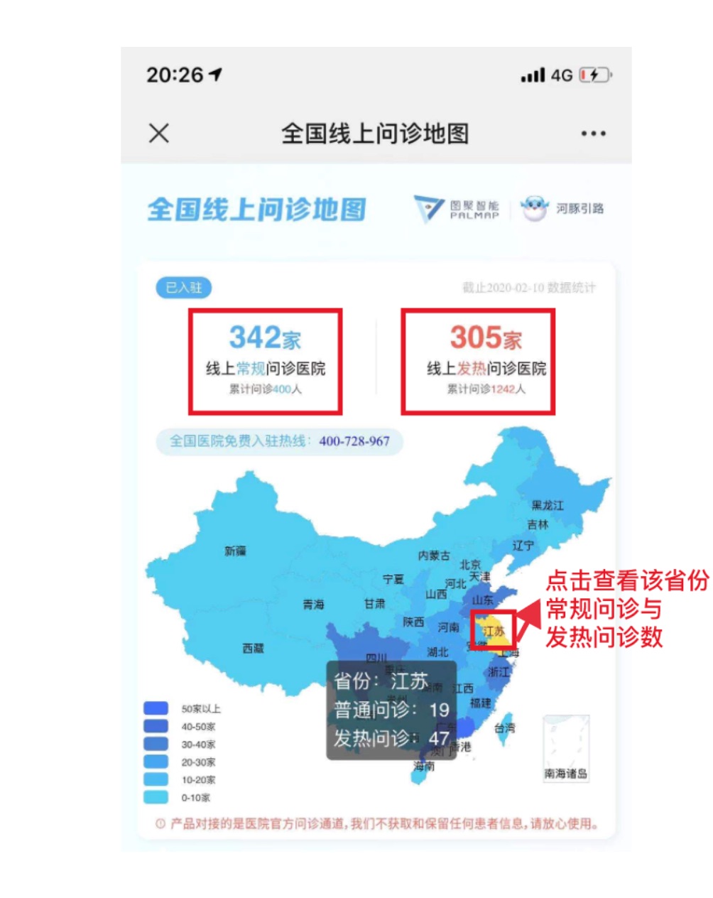 进入产品后,在产品的最上边的全国地图别离显现了现在全国接入线上惯例问诊的医院数量和接入线上发热问诊的医院数量。一起点击各个省份,也会别离显现出各个省份现在现已接入的线上惯例问诊的医院数量和线上发热问诊医院的数量。
