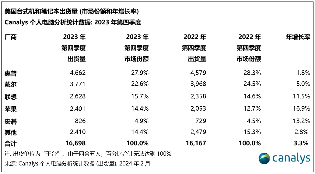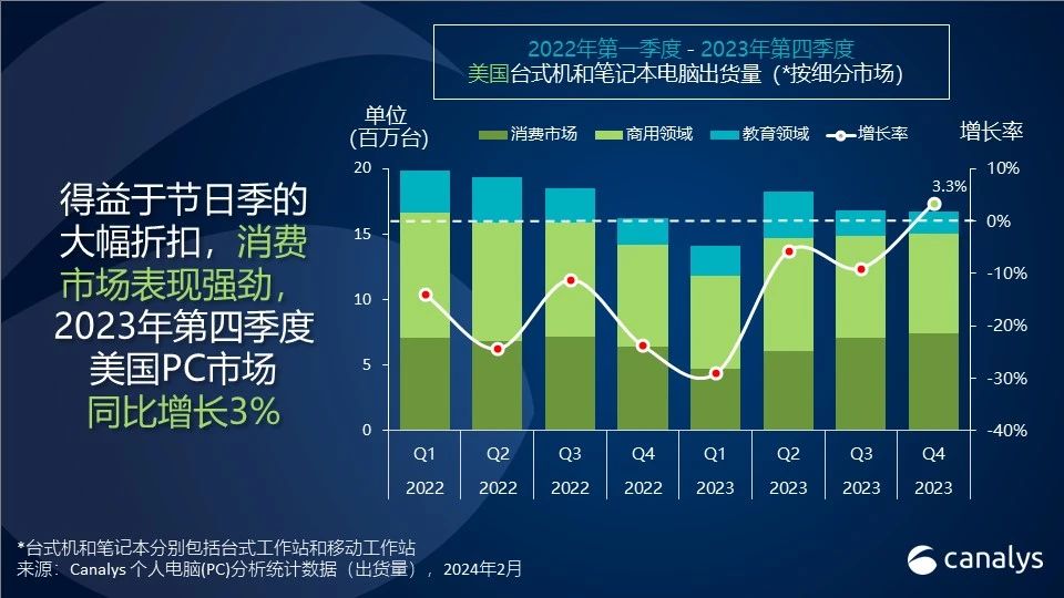 依据Canalys发布的陈述,2023年第四季度,美国个人电脑(PC)(包括台式机、笔记本和工作站)出货量同比增加 3.3%,到达 1670 万台。消费商场受节日季推进,同比增加 15.1%。商用范畴出货同比小幅下降2.2%,而教育范畴降幅较大,同比下降13.4%。美国PC商场反弹信号,预示着商场在未来两年将迎来增加,2024年和2025年美国 PC 商场体现将呈现微弱态势。