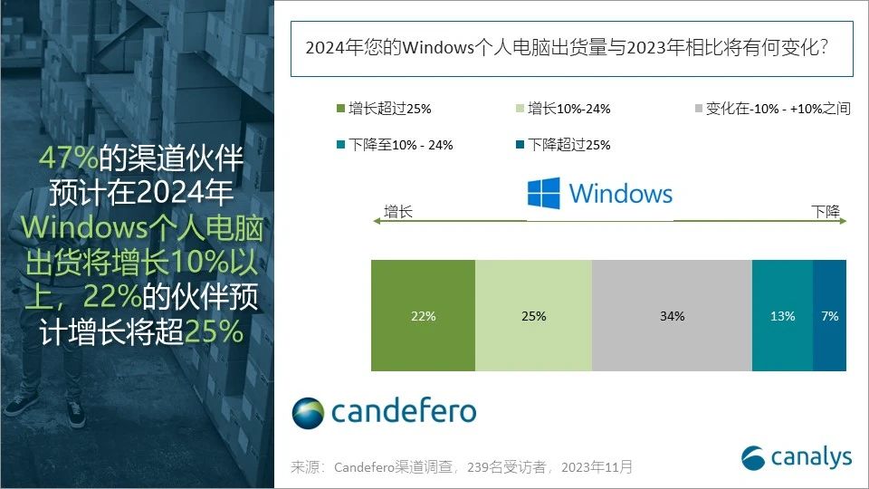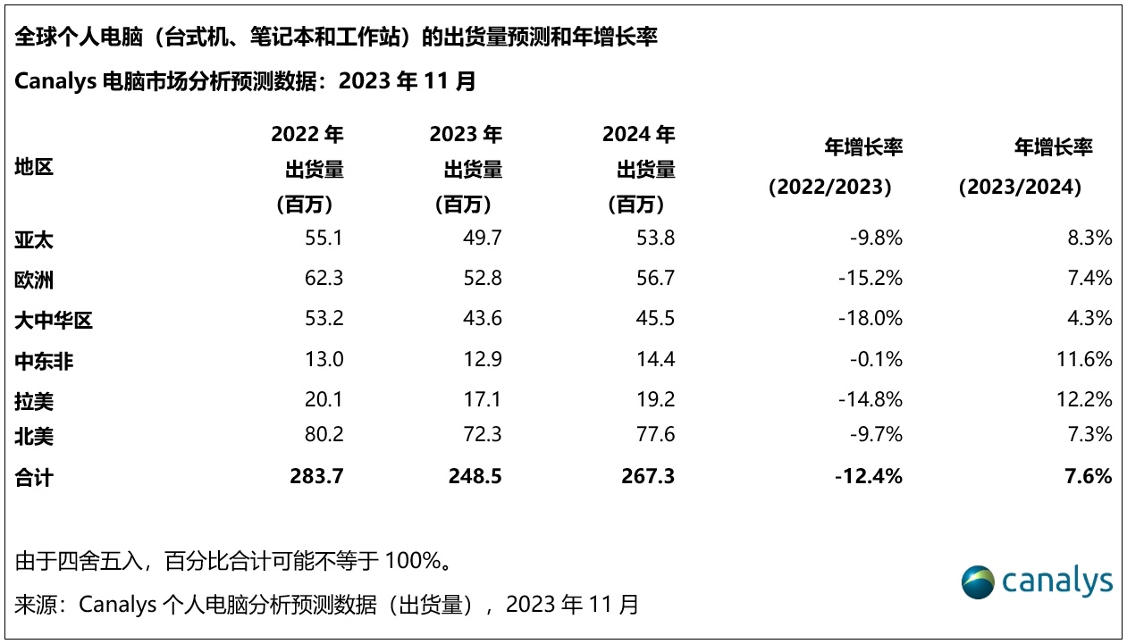 依据Canalys发布的陈述,全球个人电脑出货量在接连七个季度跌落后有望迎来复苏。在节日旺季和宏观经济改进的推进下,估计2023年第四季度商场将增加5%。展望未来,2024年全年出货量估计到达2.67亿台,较2023年增加8%,这首要得益于Windows的更新周期,以及具有AI功用和选用Arm架构电脑的兴起。