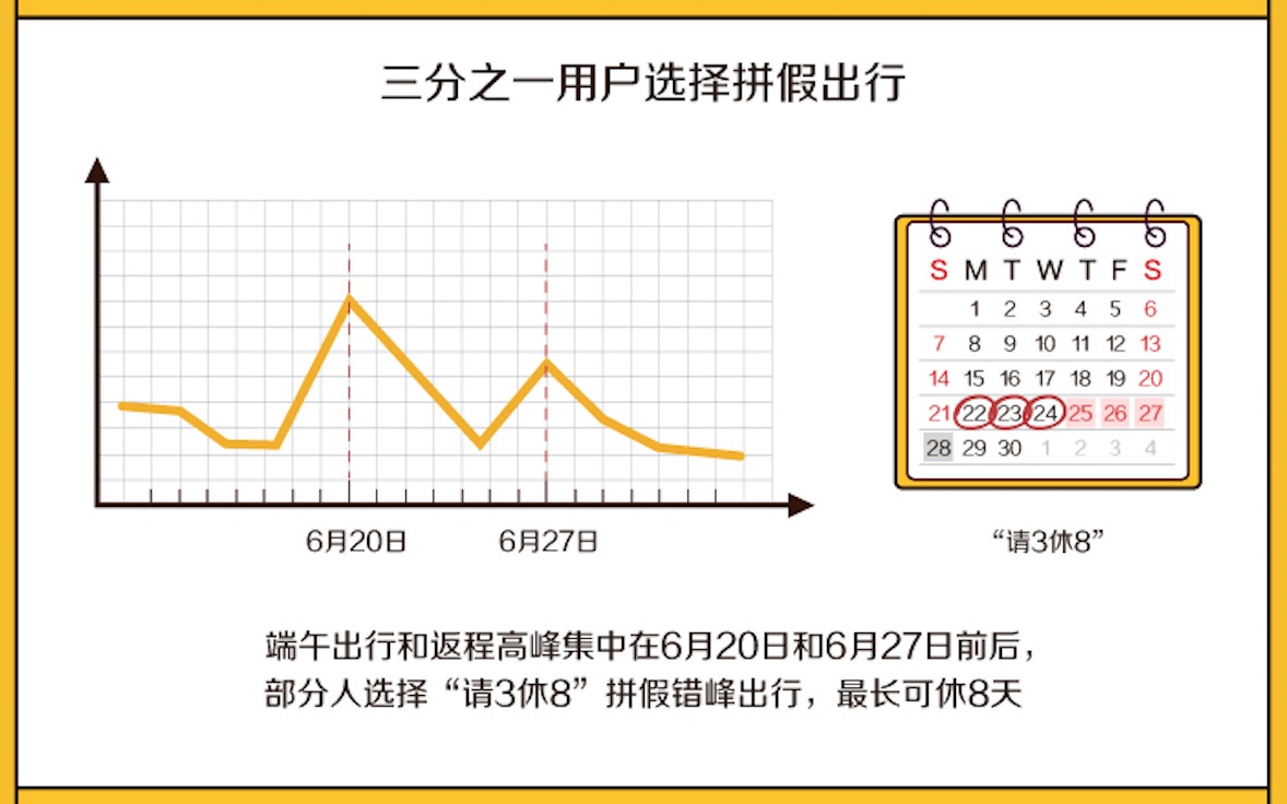 本年端午假期会集在周末,不少上班族会挑选“请 3 休 8”拼假错峰出行,享用 8 天超长假期。美团大数据显现,端午出行和返程顶峰别离会集在 6 月 20 日和 6 月 27 日前后,三分之一用户会挑选拼假出行。