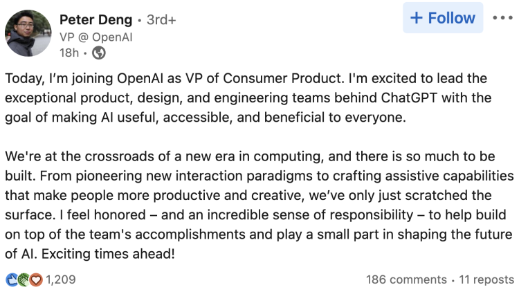 ChatGPT现在有了新产品负责人。Peter Deng经过领英发布动态,称他正式以“顾客产品副总裁”的身份参加OpenAI。